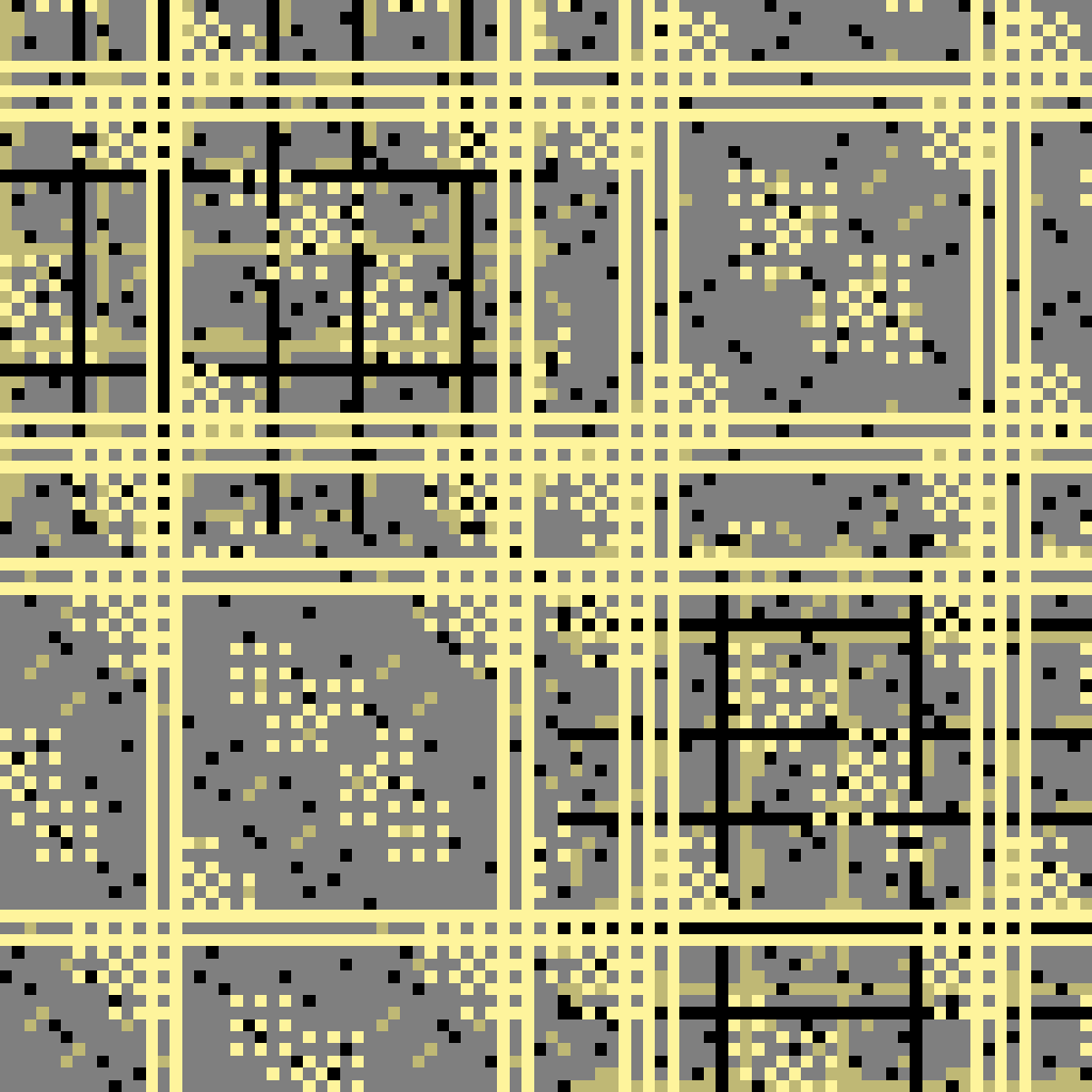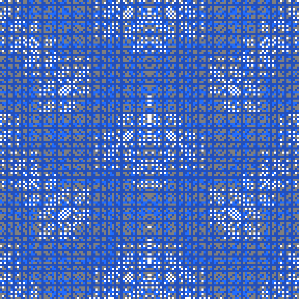 The original algorithm, demonstrated above, was one of my first shaders and also draws on elements of one of my first complete VJ performance programs, built in Processing in late 2019. These patterns are created by a simple generative rule, a code art "one-liner;" essentially a binary test of whether pixel coordinates obey the equation (x*y) % t*n % t = 0 As a generative artist I seek definitions like this which, despite their apparent simplicity, surprise me with the variety of orders they can produce.